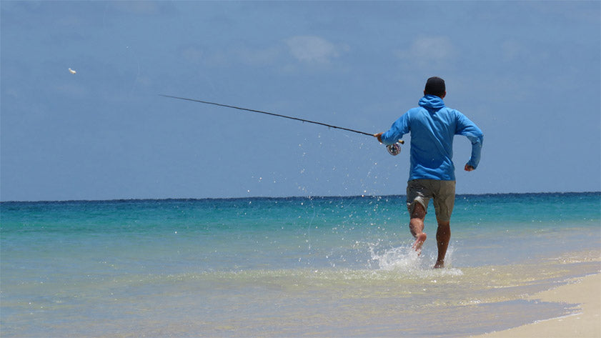 As I rolled left and stripped, both fish flared their combs in the crumbling wave and turned tight U's away from me. When they did, the line tightened in my hand and the rod became heavy as I now lifted to feel the heavy pull of a fish. The pair of fish ran hard back to the deep blue water, one of them taking me and my fly with it. Once settled and tight with loose line now safe on the reel I shouted to my wife Ali and friend Paul. Moments later the fish launched into a series of tarpon-esque jumps like none I've ever seen or even heard of rooster fish doing. It was pure thrill. It was pure joy.